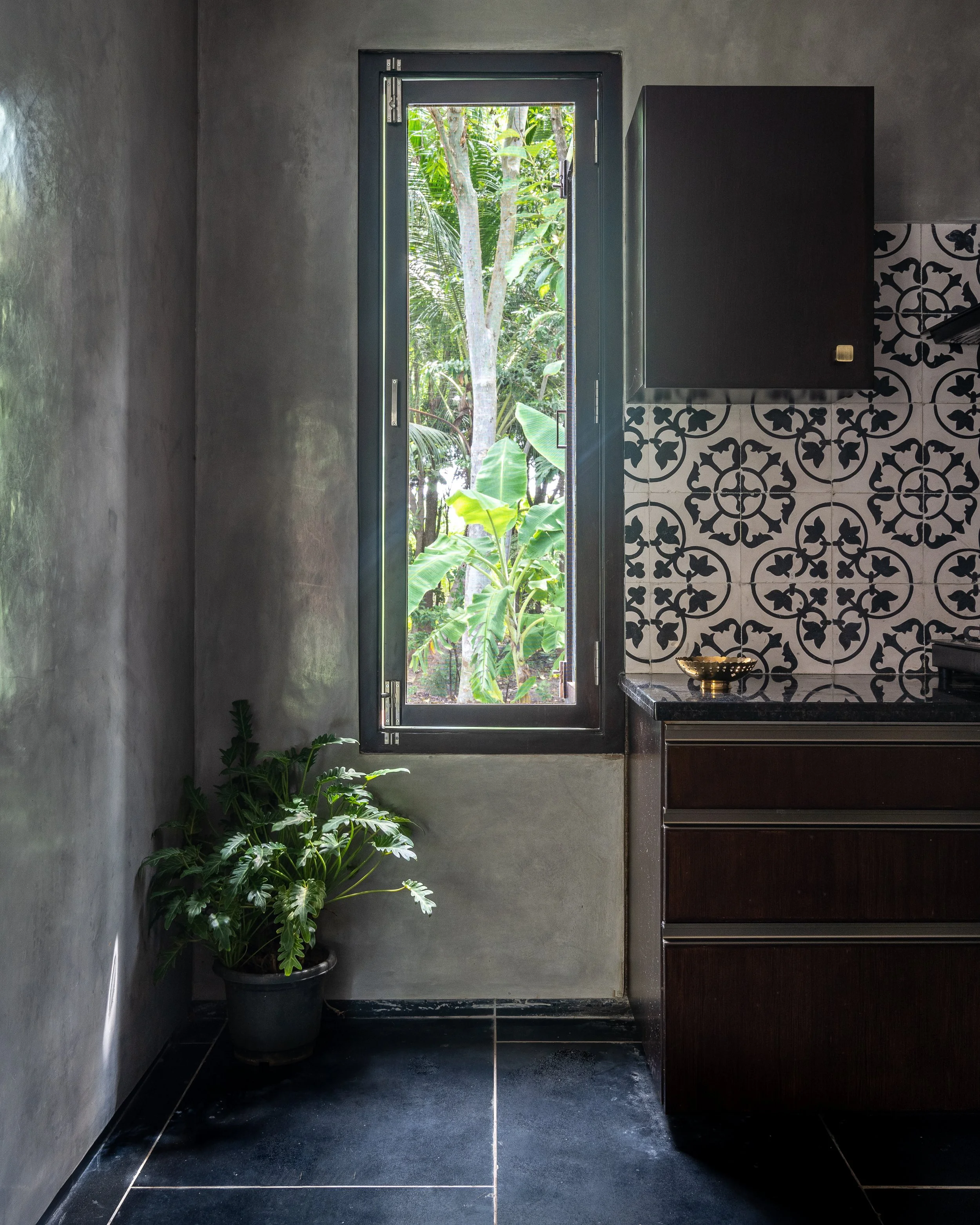 The architecture captures the emotions and energies of the land, which at one point supported a family of ten brothers and their mother’s meditation practices. The design evokes the simplicity of rural life using timeless design and materials. The building footprint is kept at 140 sqm to minimize impact on local vegetation and for an efficient microclimate. The house is set far back from the street allowing to create a beautifully landscaped buffer breathing space that gives only a sneak peek of the residence.