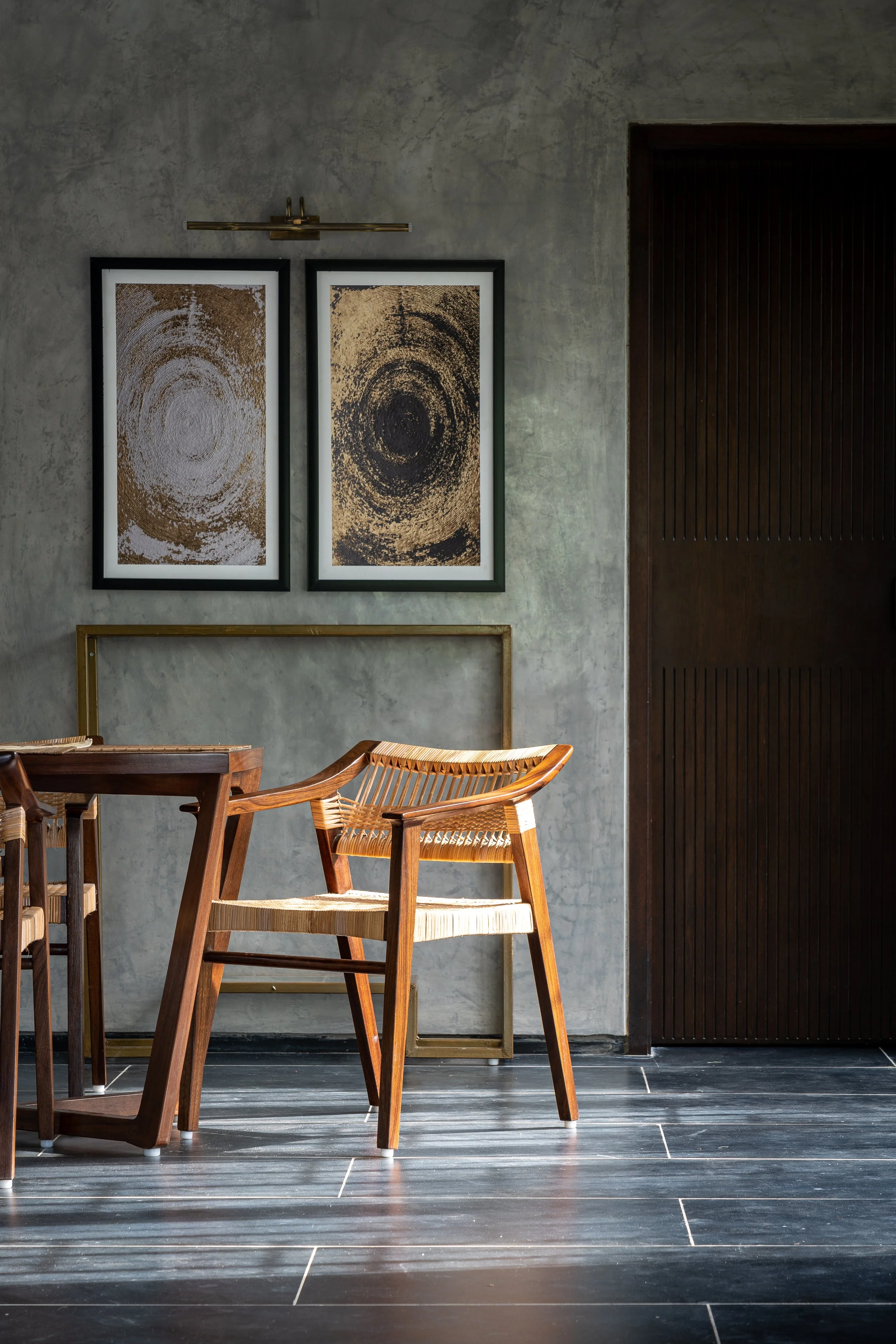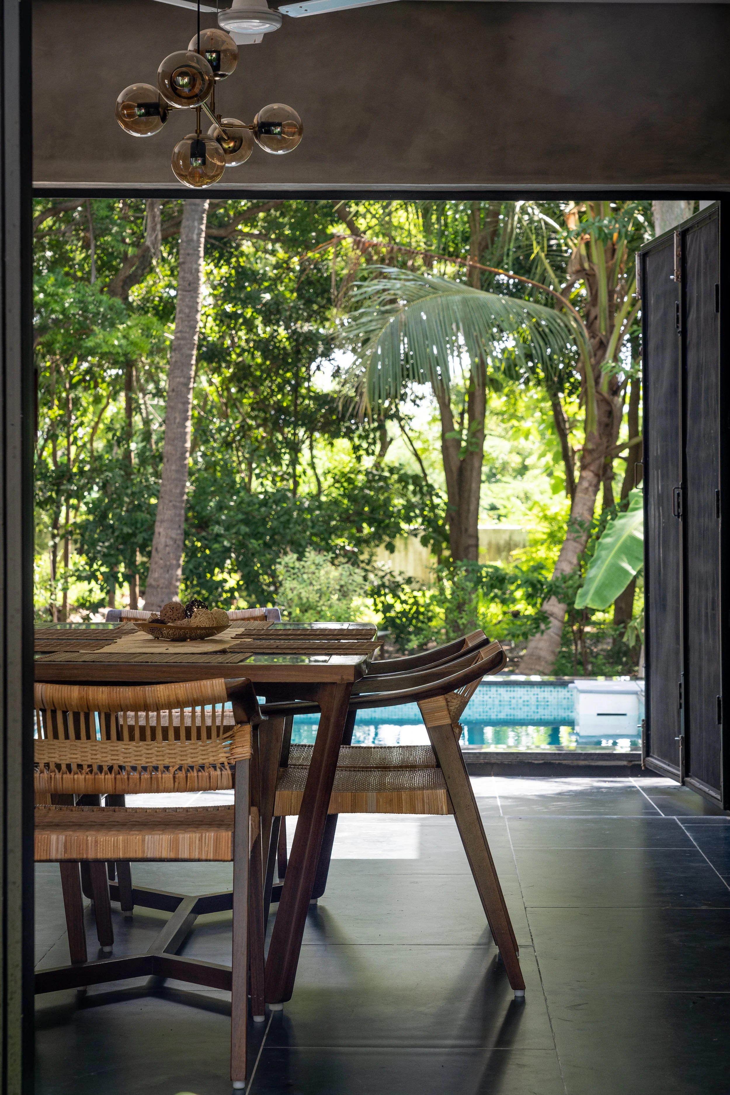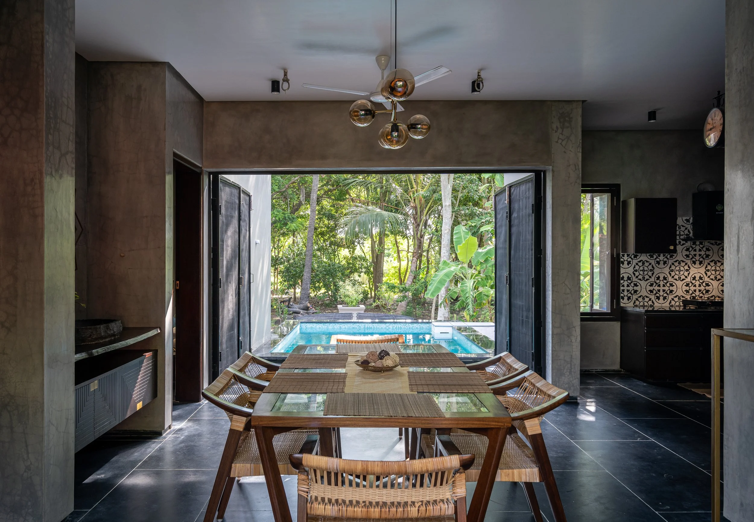 The architectural plan follows the primary aspects of Indian Vaastu shastra mandala. The built form consists of two cuboids hosting the living and cooking spaces with bedrooms separated for privacy. The connecting transition space is the dining area that is the heart of the house. The dining area overlooks the open court on one side and the outdoor deck and plunge pool on the other side. It acts as the central focal point of the house – in essence and in plan. The outdoor deck doubles up as family gathering space during festive occasions. The infinity plunge pool overlooks the fruit orchards and the 100-year-old artesian well from which it draws water.